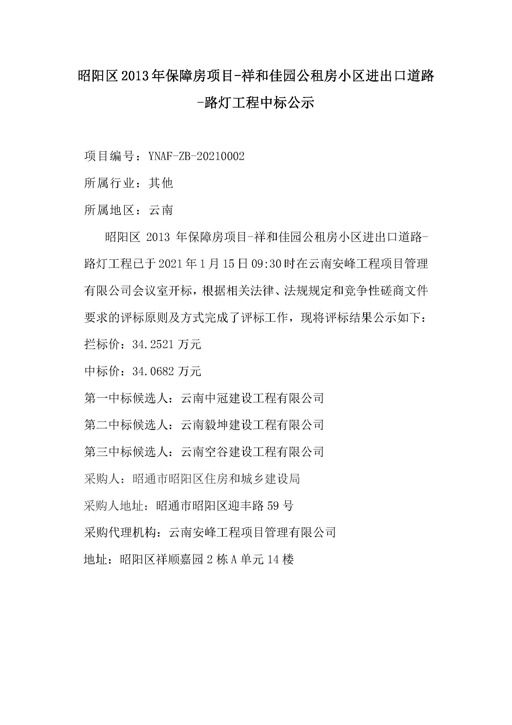 昭陽區(qū)2013年保障房項目-祥和佳園公租房小區(qū)進出口道路-路燈工程中標公示