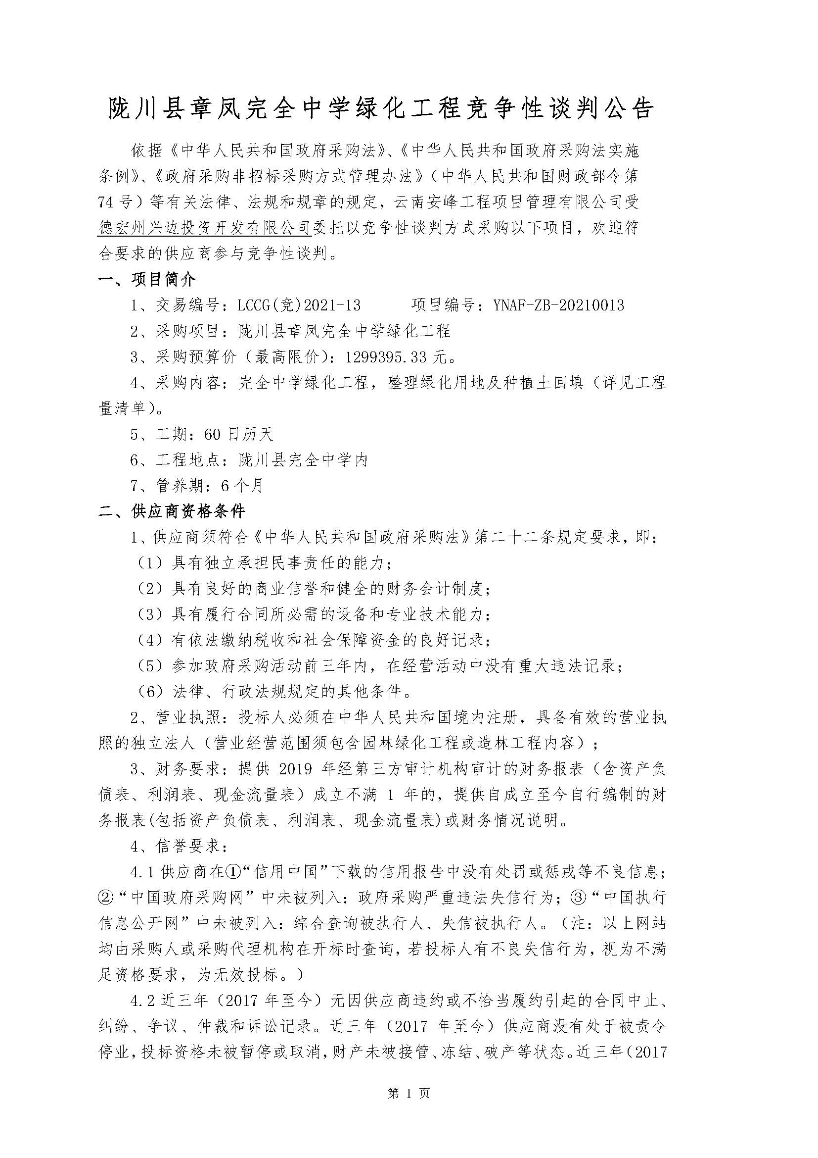 隴川縣章鳳完全中學(xué)綠化工程競(jìng)爭(zhēng)性談判公告