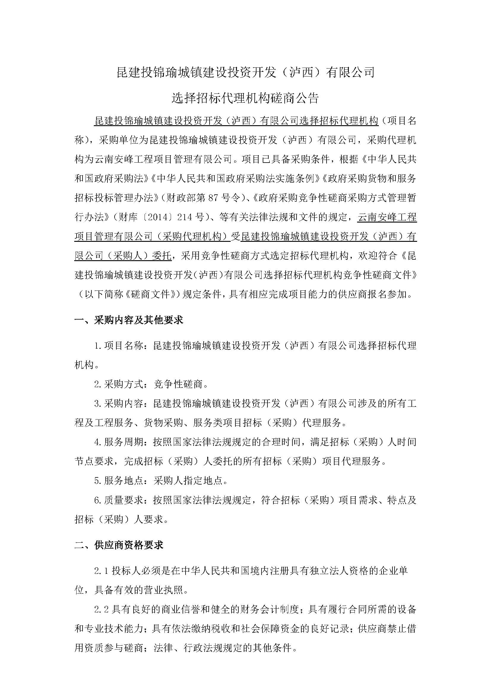 昆建投錦瑜城鎮(zhèn)建設(shè)投資開發(fā)(瀘西)有限公司 選擇招標(biāo)代理機(jī)構(gòu)磋商