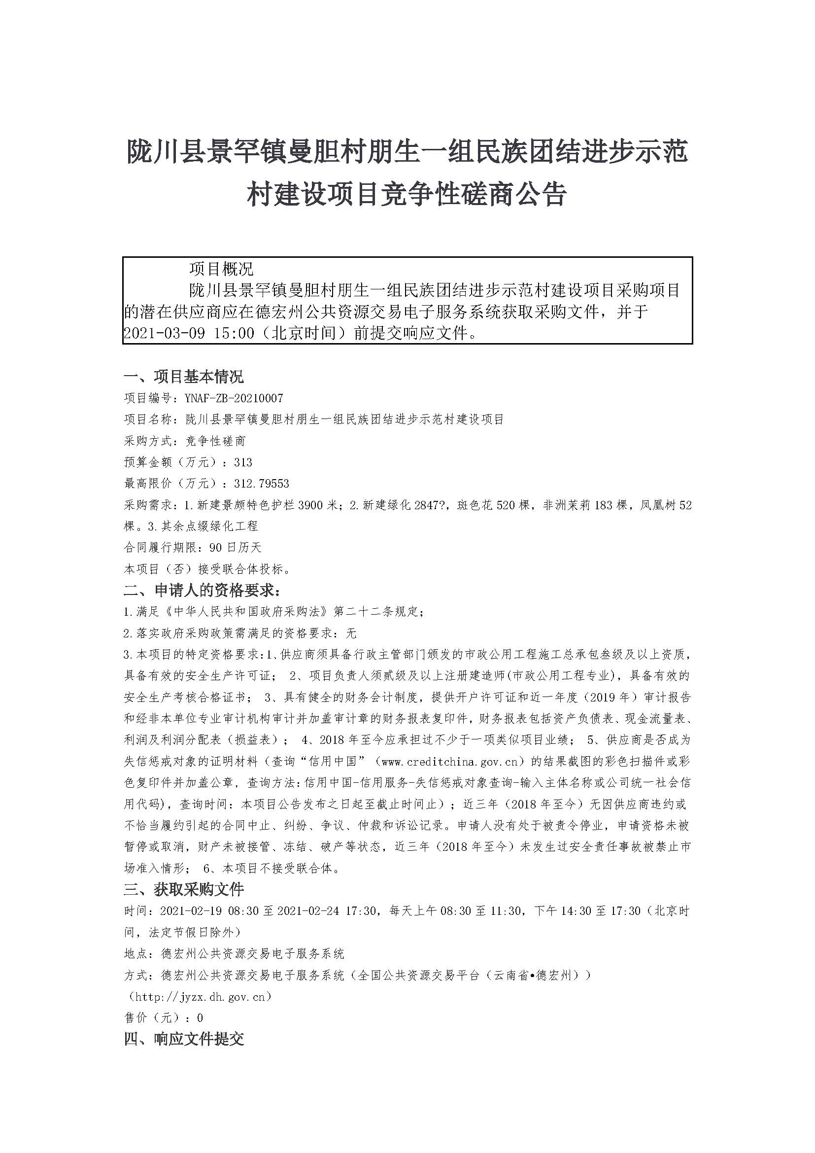 隴川縣景罕鎮(zhèn)曼膽村朋生一組民族團(tuán)結(jié)進(jìn)步示范村建設(shè)項(xiàng)目競(jìng)爭(zhēng)性磋商公告