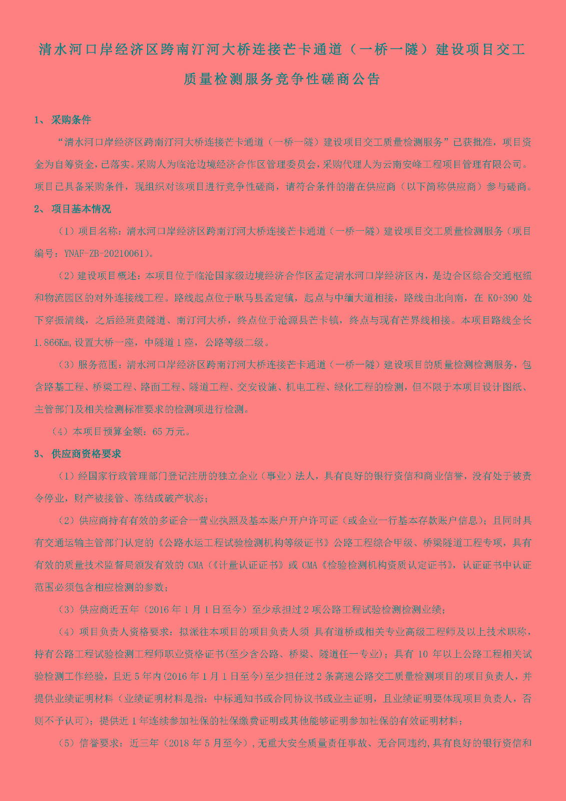 清水河口岸經(jīng)濟(jì)區(qū)跨南汀河大橋連接芒卡通道(一橋一隧)建設(shè)項(xiàng)目交工質(zhì)量檢測(cè)服務(wù)競(jìng)爭(zhēng)性磋商公告
