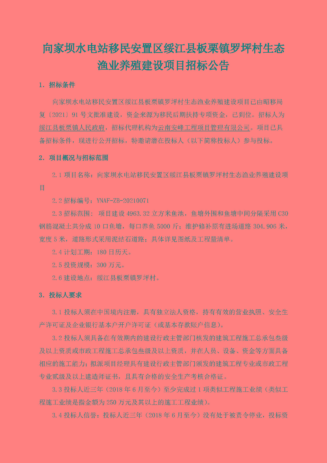 向家壩水電站移民安置區(qū)綏江縣板栗鎮(zhèn)羅坪村生態(tài)漁業(yè)養(yǎng)殖建設項目招標公告