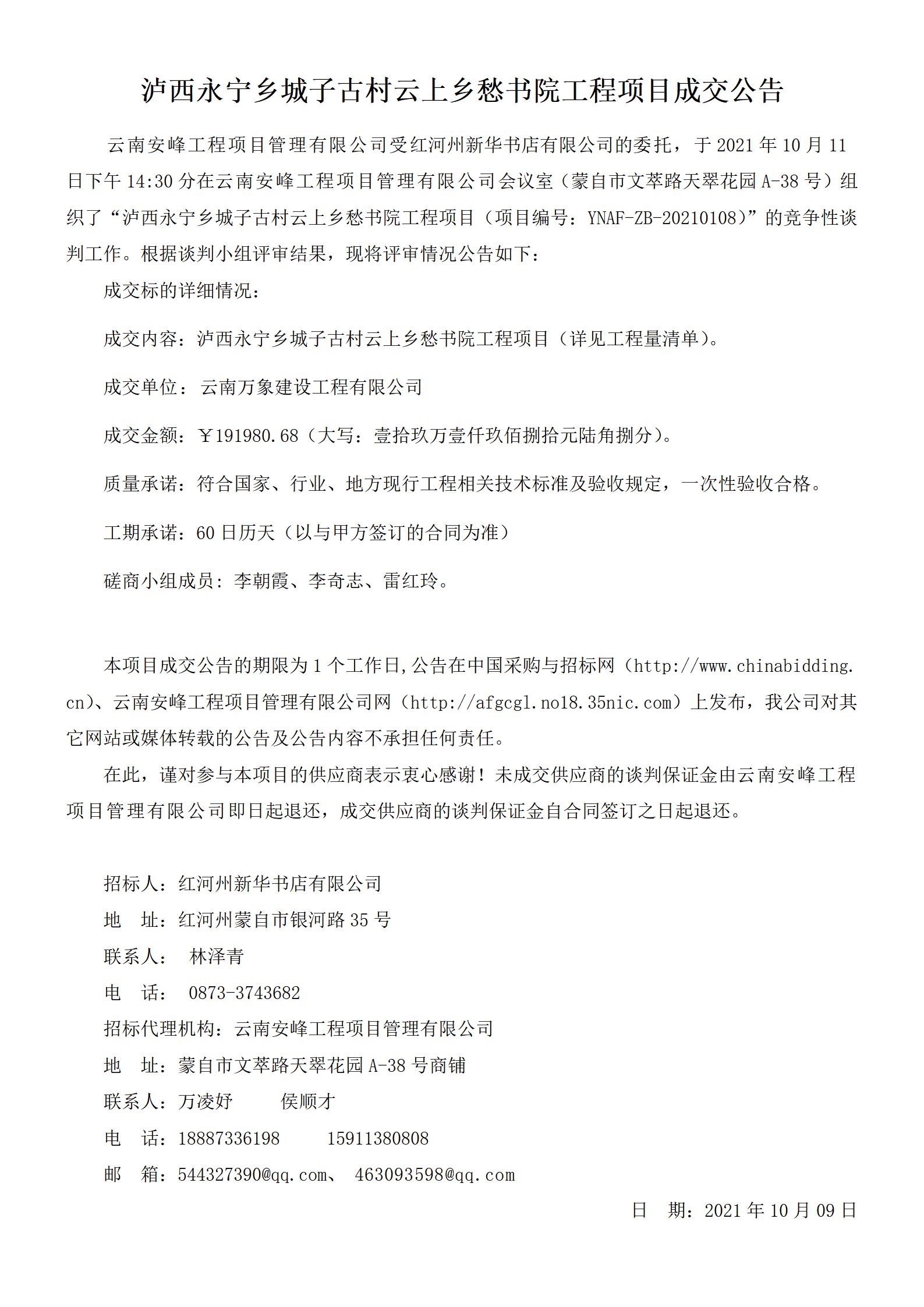 瀘西永寧鄉(xiāng)城子古村云上鄉(xiāng)愁書院工程項目成交公告