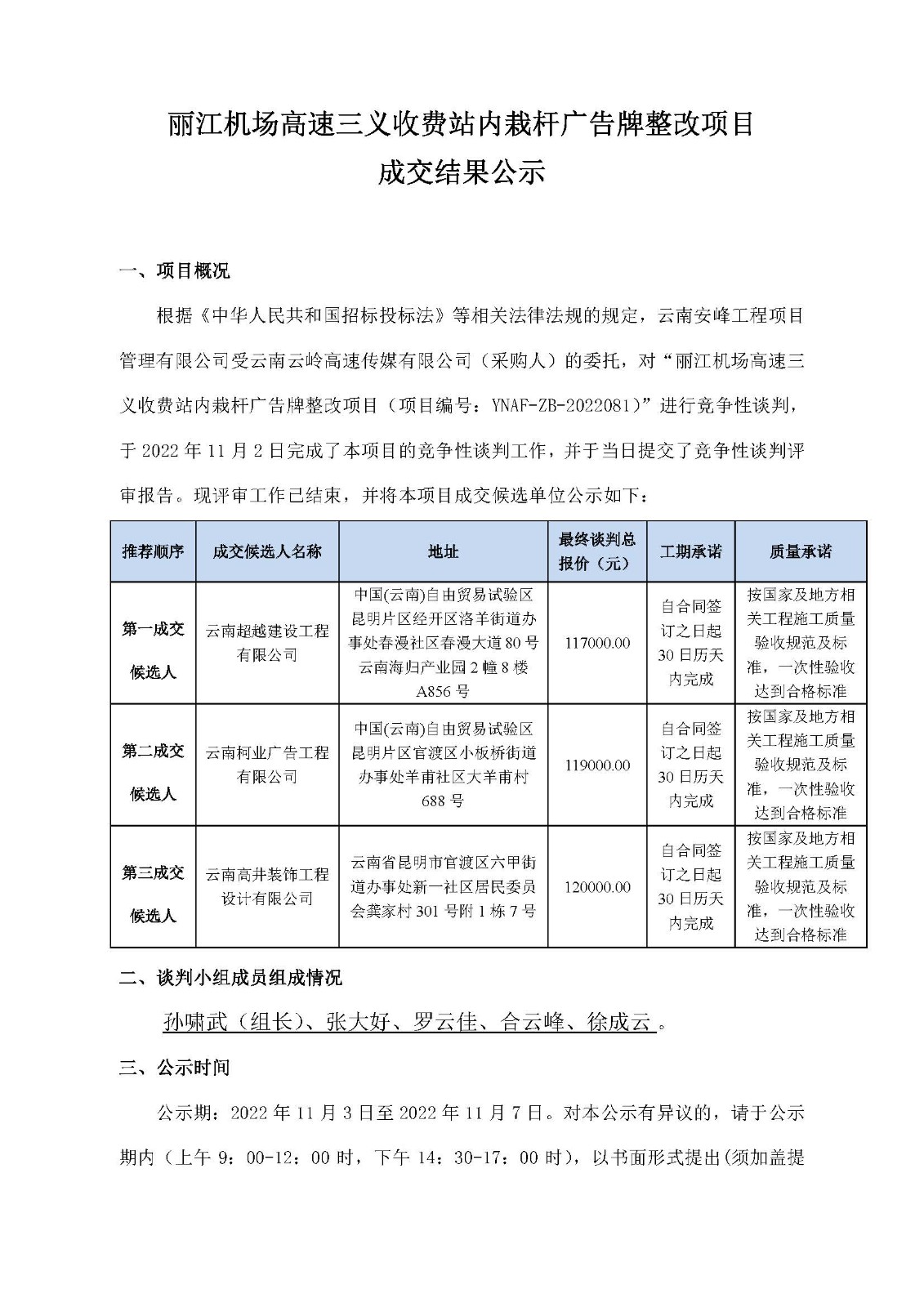 麗江機(jī)場(chǎng)高速三義收費(fèi)站內(nèi)栽桿廣告牌整改項(xiàng)目成交結(jié)果公示
