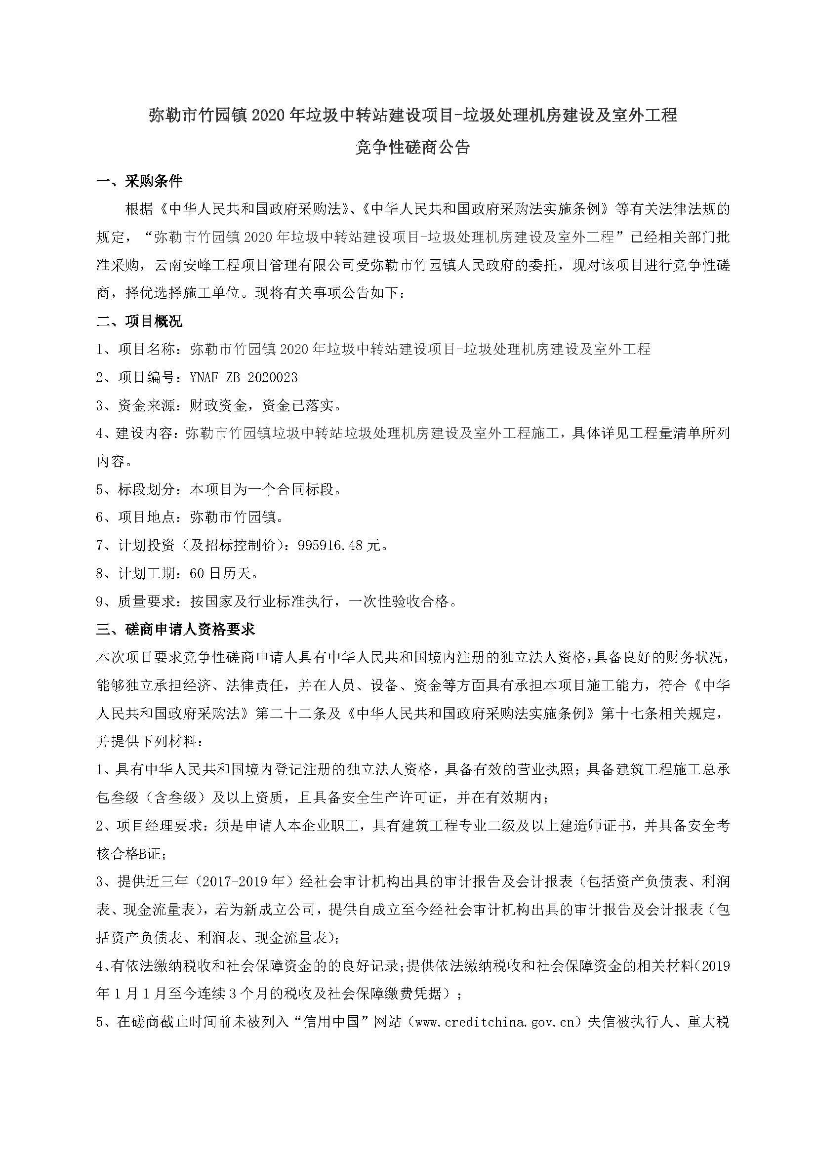 彌勒市竹園鎮(zhèn)2020年垃圾中轉(zhuǎn)站建設項目-垃圾處理機房建設及室外工程 競爭性磋商公告