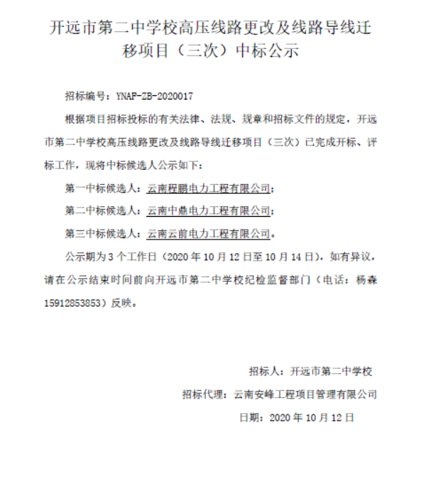 開遠市第二中學(xué)校高壓線路更改及線路導(dǎo)線遷移項目(三次)中標公示