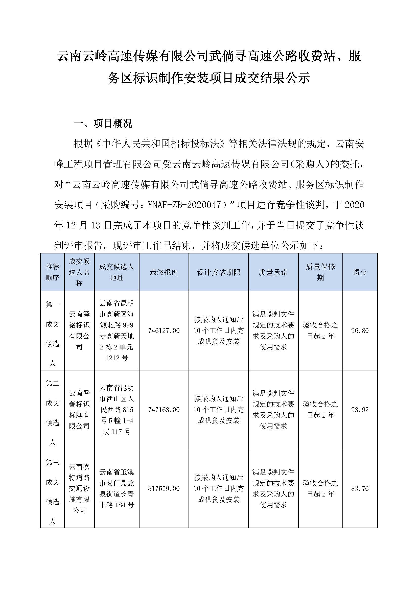 云南云嶺高速傳媒有限公司武倘尋高速公路收費站、服務(wù)區(qū)標識制作安裝項目成交結(jié)果公示