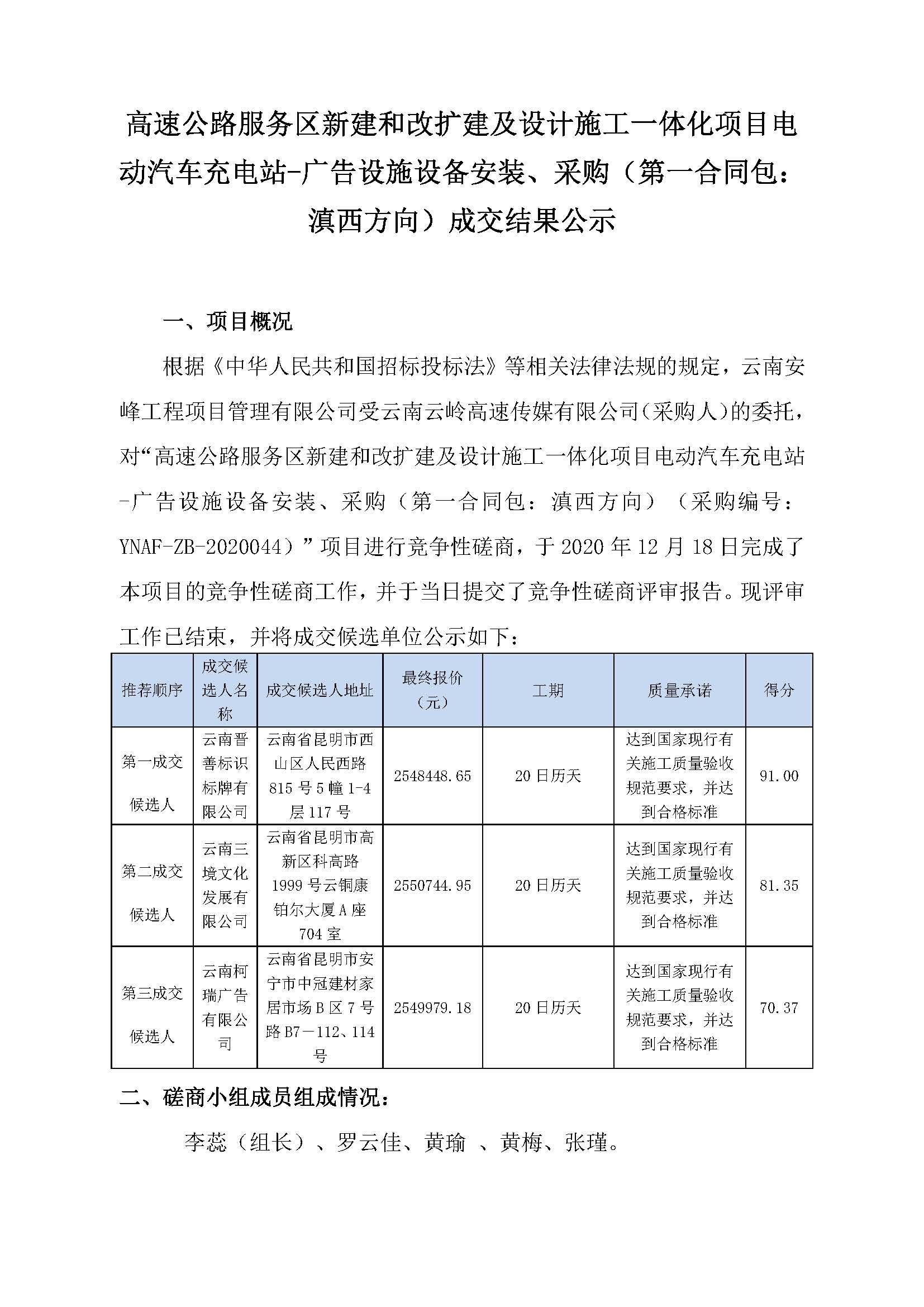 高速公路服務(wù)區(qū)新建和改擴(kuò)建及設(shè)計(jì)施工一體化項(xiàng)目電動(dòng)汽車充電站-廣告設(shè)施設(shè)備安裝、采購(第一合同包:滇西方向)成交結(jié)果公示