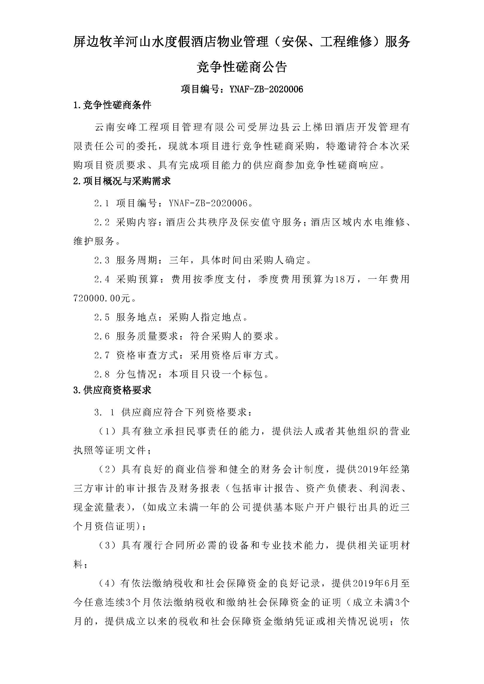 屏邊牧羊河山水度假酒店物業(yè)管理(安保、工程維修)服務(wù)