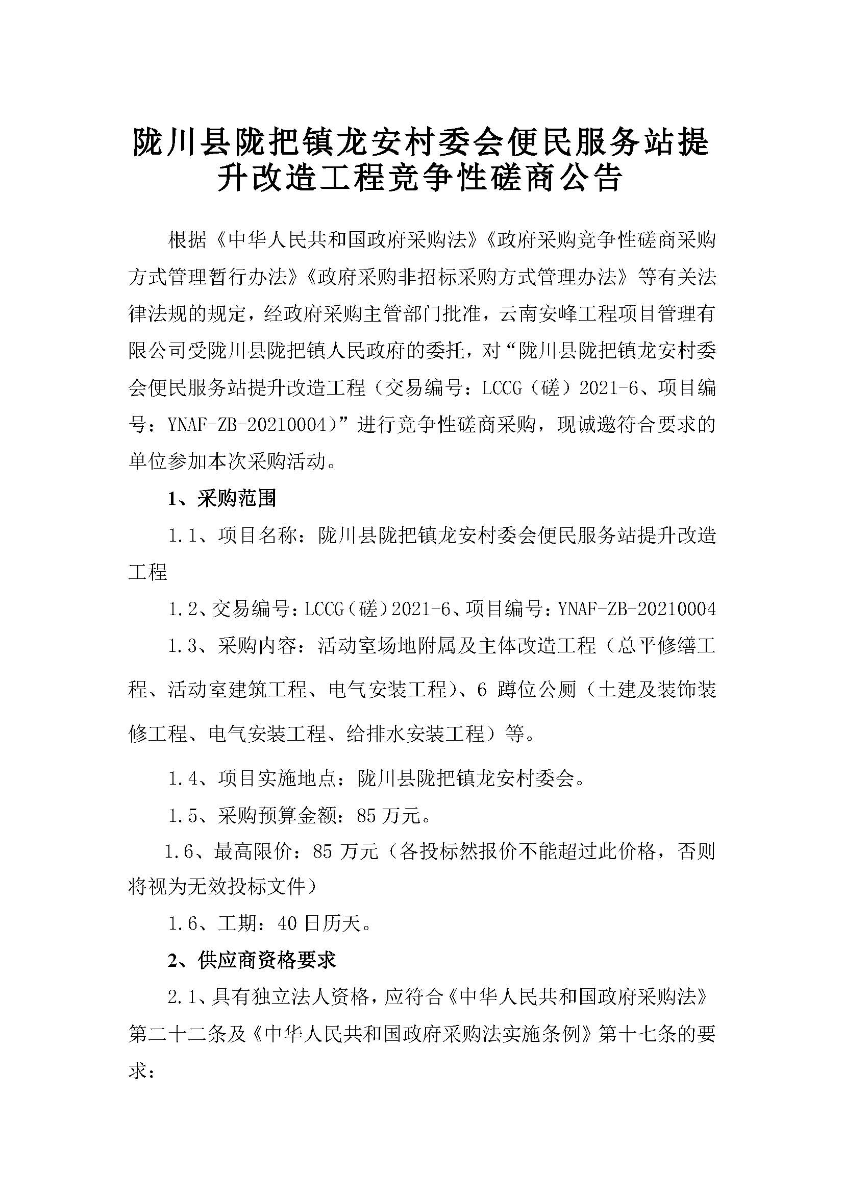 隴川縣隴把鎮(zhèn)龍安村委會(huì)便民服務(wù)站提升改造工程競爭性磋商公告
