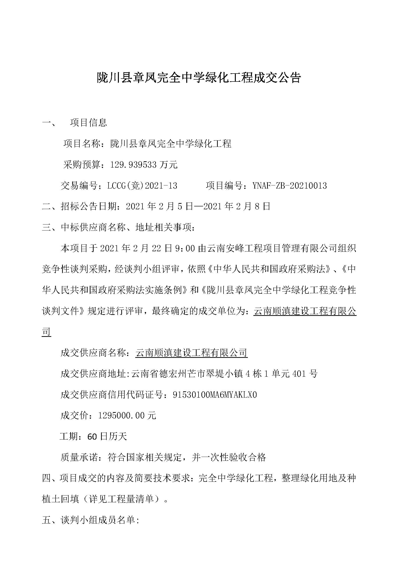 隴川縣章鳳完全中學(xué)綠化工程成交公告