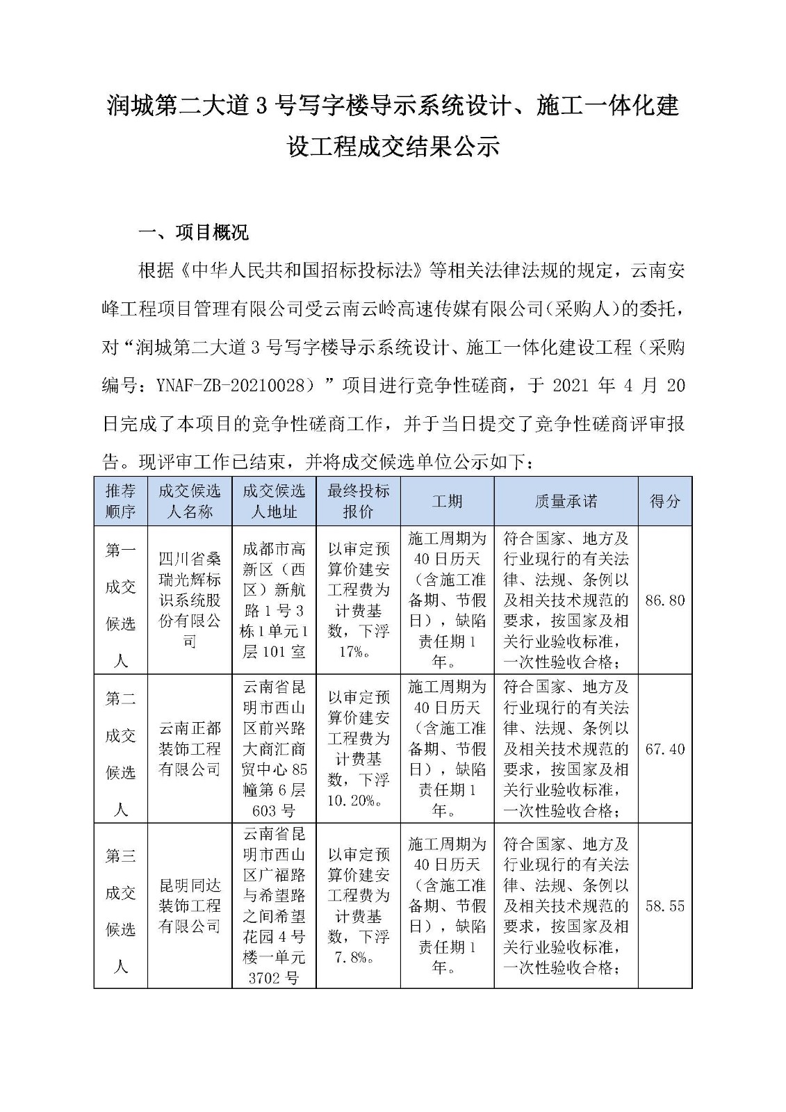 潤城第二大道3號寫字樓導(dǎo)示系統(tǒng)設(shè)計(jì)、施工一體化建設(shè)工程成交結(jié)果公示