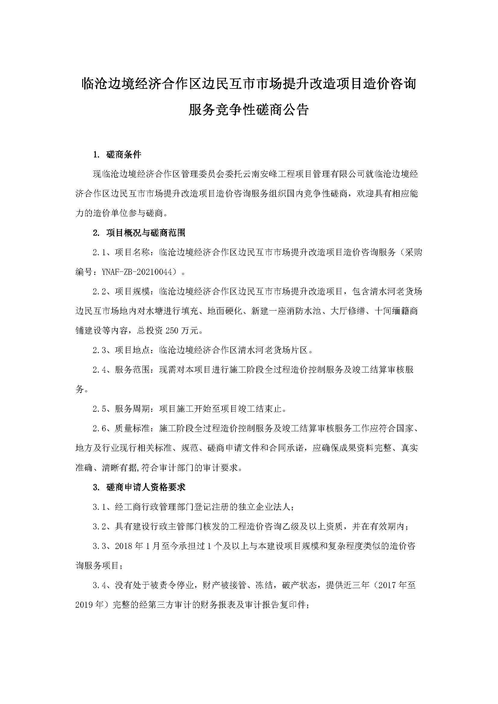 臨滄邊境經(jīng)濟(jì)合作區(qū)邊民互市市場(chǎng)提升改造項(xiàng)目造價(jià)咨詢服務(wù)競(jìng)爭(zhēng)性磋商公告