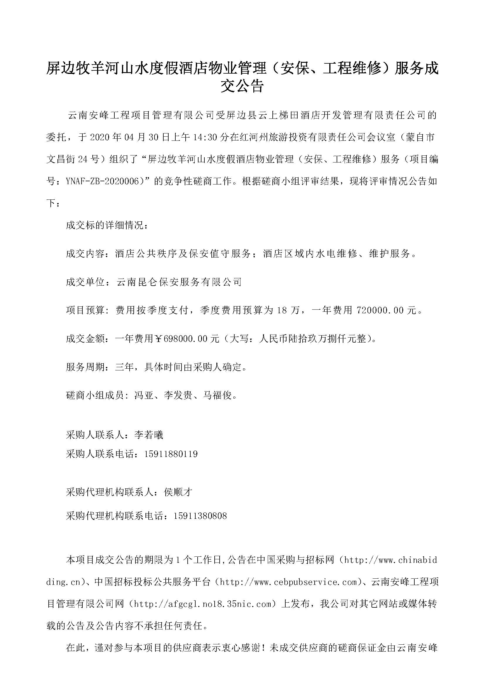 屏邊牧羊河山水度假酒店物業(yè)管理(安保、工程維修)服務