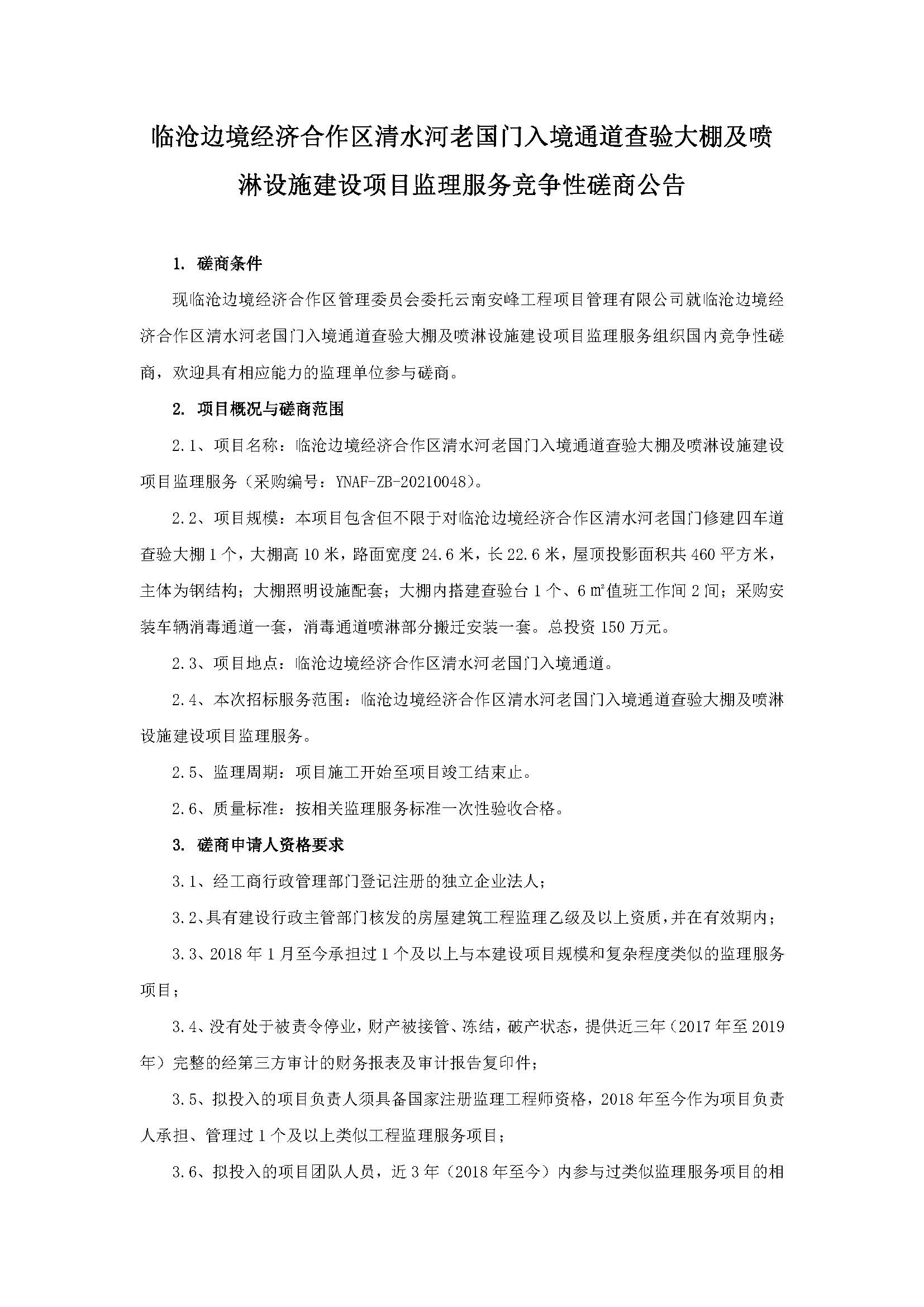 臨滄邊境經(jīng)濟合作區(qū)清水河老國門入境通道查驗大棚及噴淋設(shè)施建設(shè)項目監(jiān)理服務(wù)競爭性磋商公告