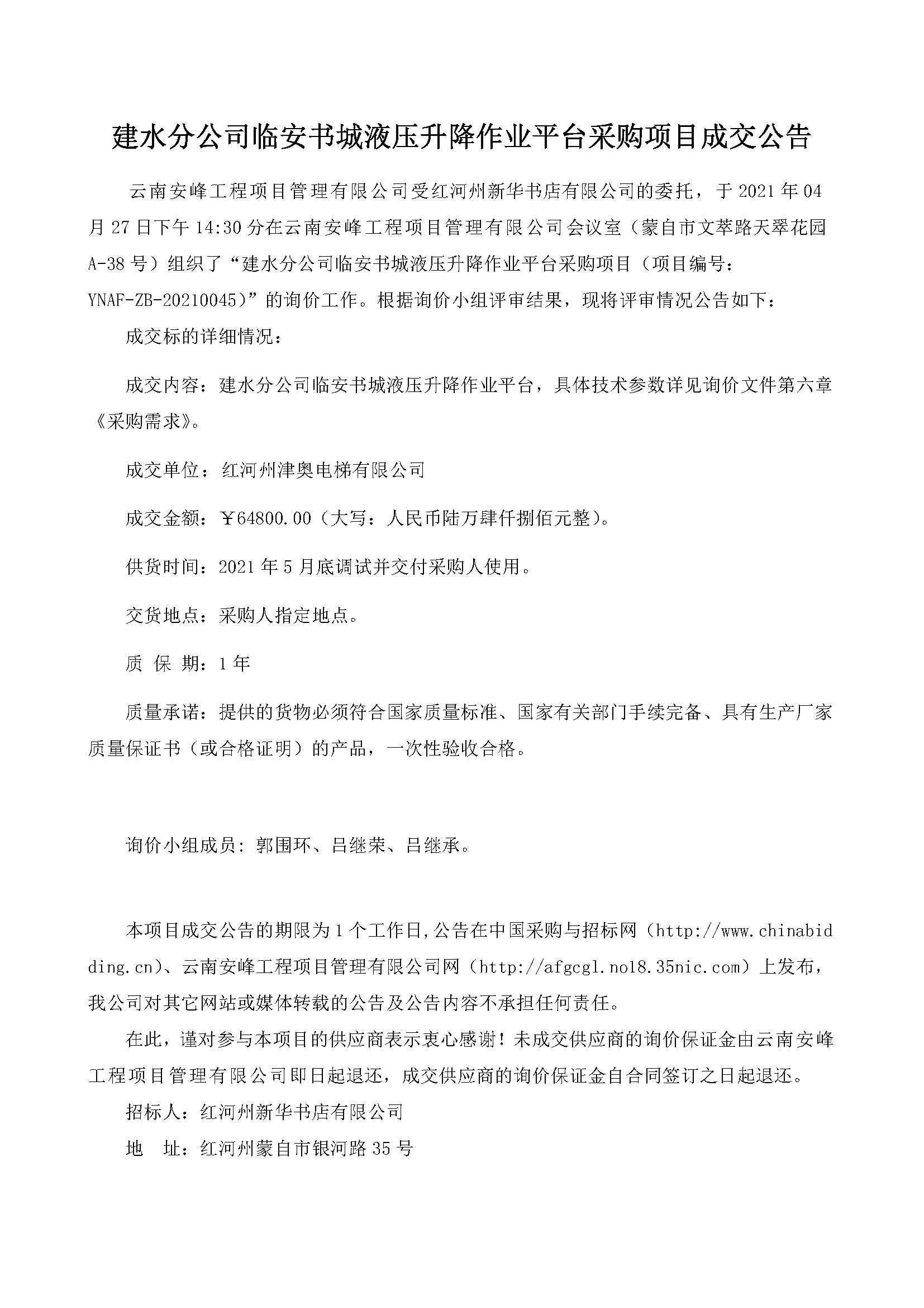 建水分公司臨安書城液壓升降作業(yè)平臺(tái)采購項(xiàng)目成交公告