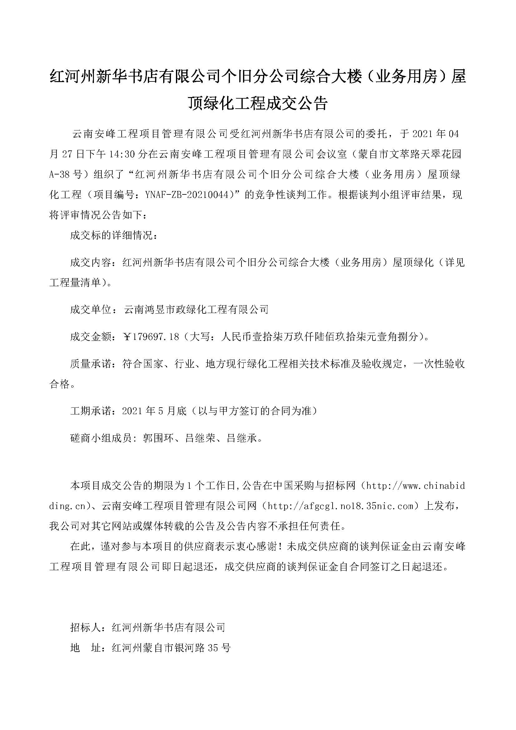 紅河州新華書店有限公司個舊分公司綜合大樓(業(yè)務(wù)用房)屋頂綠化工程成交公告