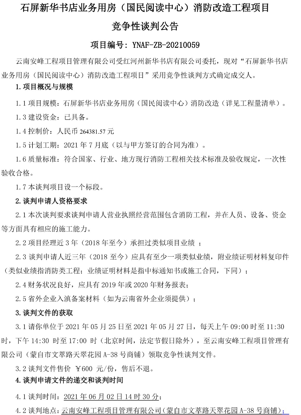 石屏新華書店業(yè)務(wù)用房(國民閱讀中心)消防改造工程項目競爭性談判公告