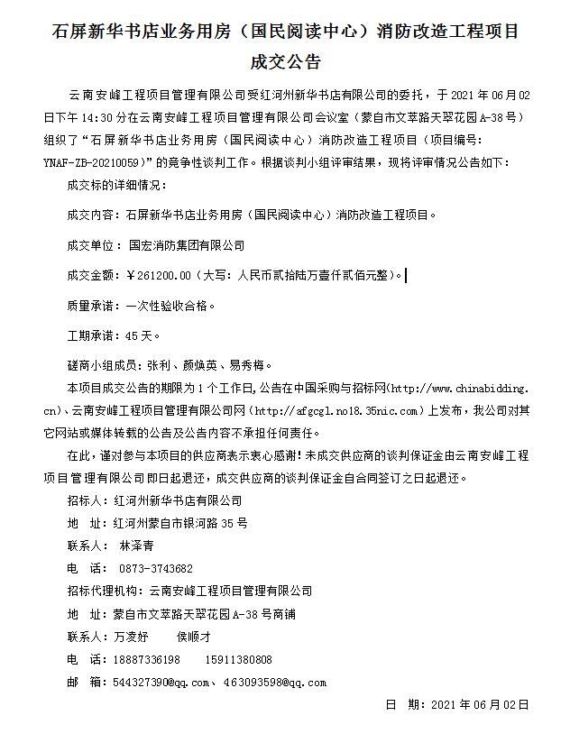石屏新華書店業(yè)務(wù)用房(國民閱讀中心)消防改造工程項(xiàng)目成交公告