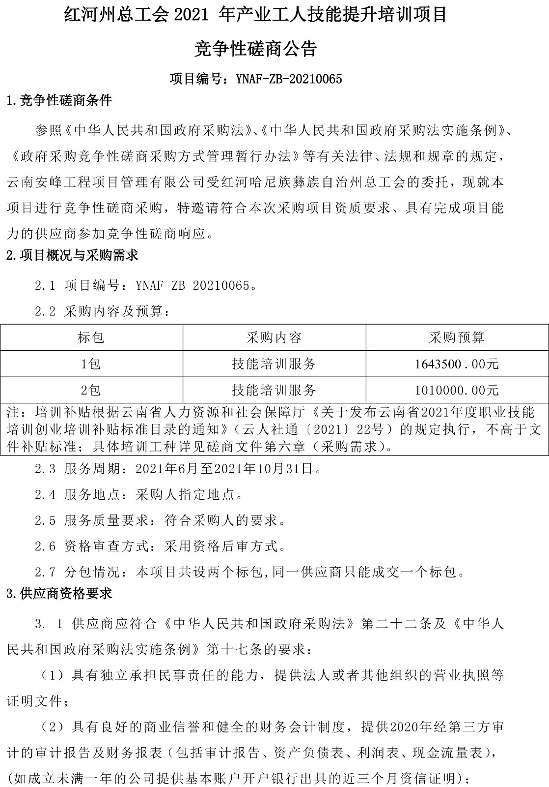 紅河州總工會2021 年產(chǎn)業(yè)工人技能提升培訓(xùn)項(xiàng)目競爭性磋商公告