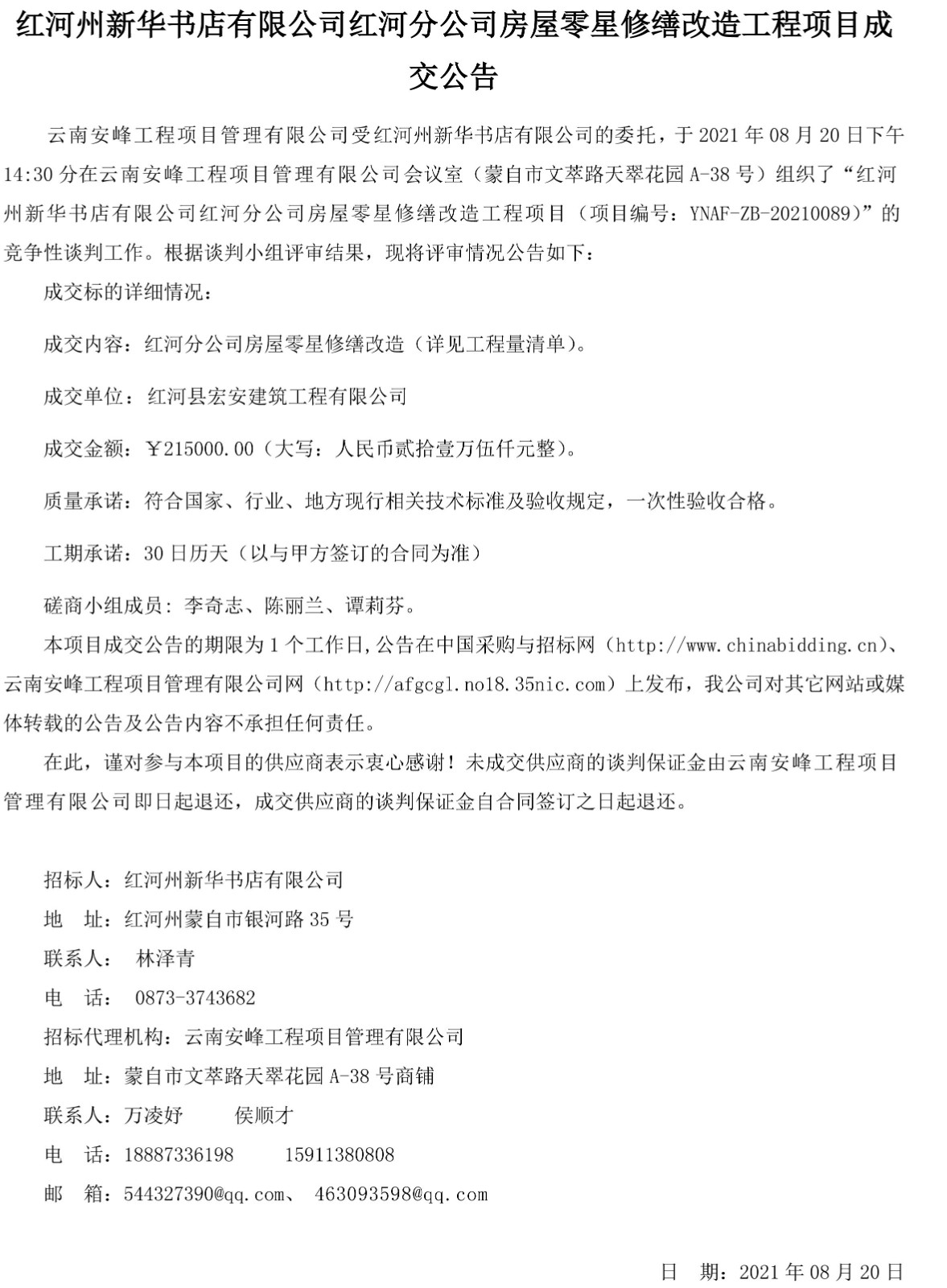 紅河州新華書店有限公司紅河分公司房屋零星修繕改造工程項(xiàng)目成交公告