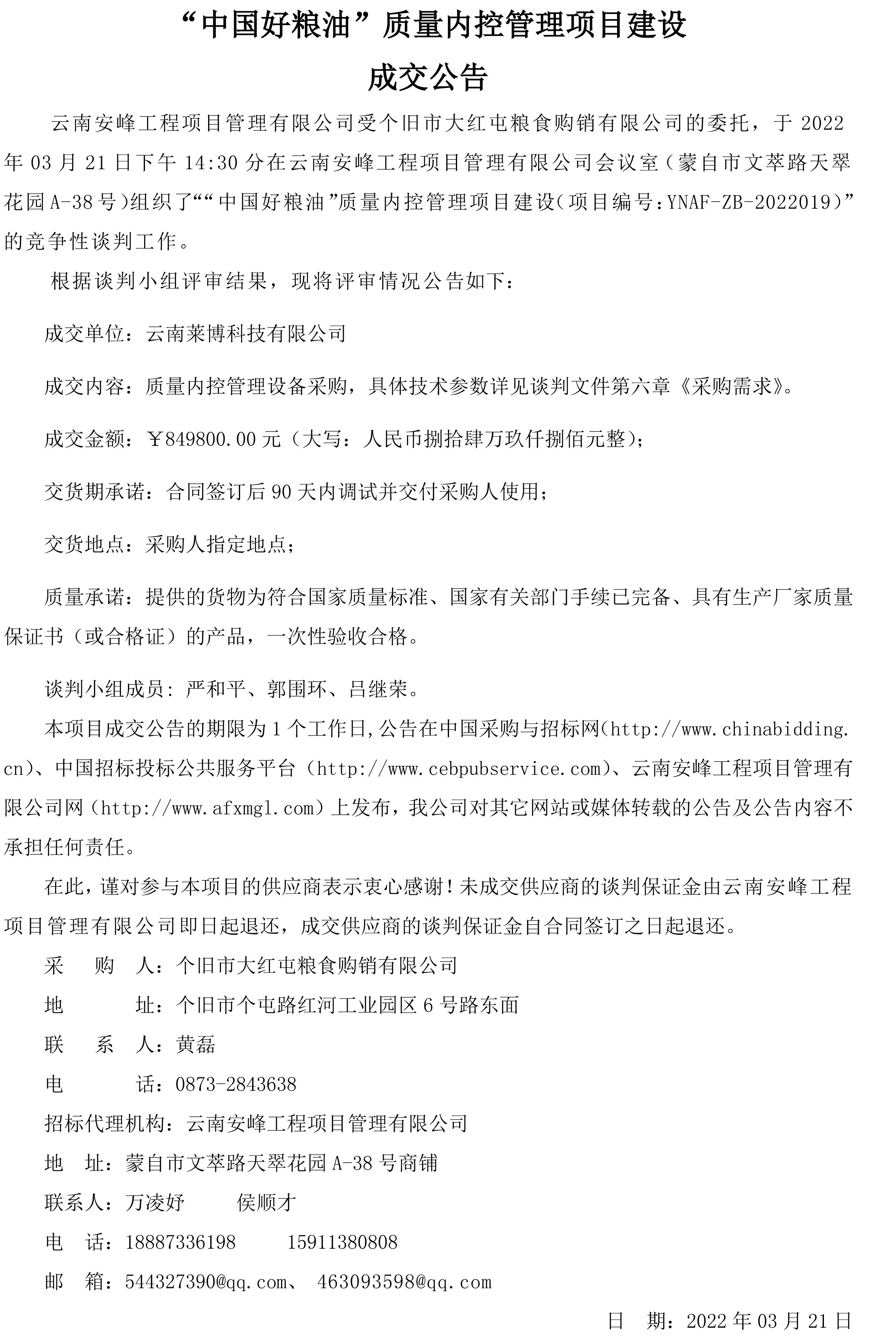 “中國(guó)好糧油”質(zhì)量?jī)?nèi)控管理項(xiàng)目建設(shè)成交公告