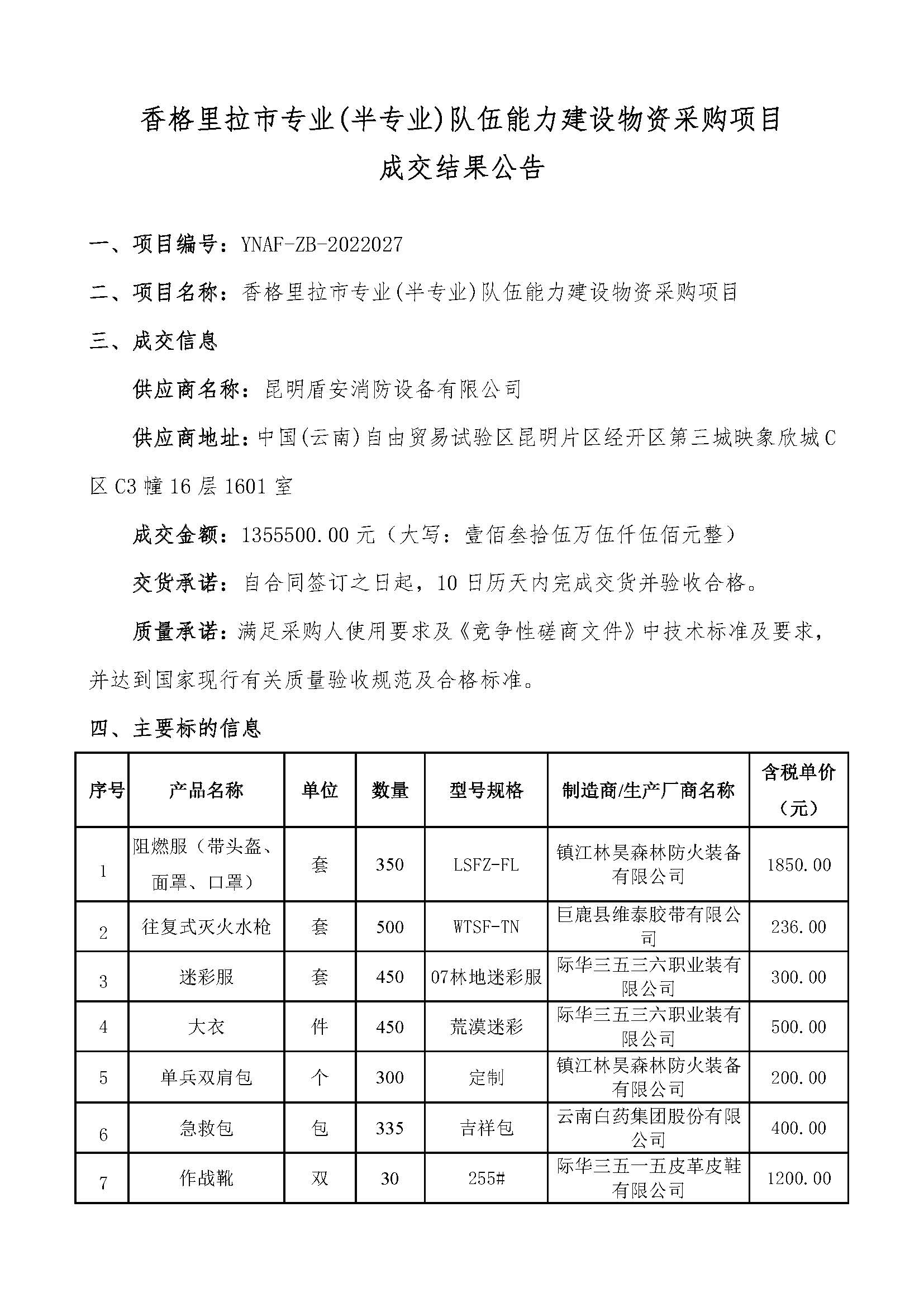 香格里拉市專業(yè)(半專業(yè))隊(duì)伍能力建設(shè)物資采購(gòu)項(xiàng)目成交結(jié)果公告
