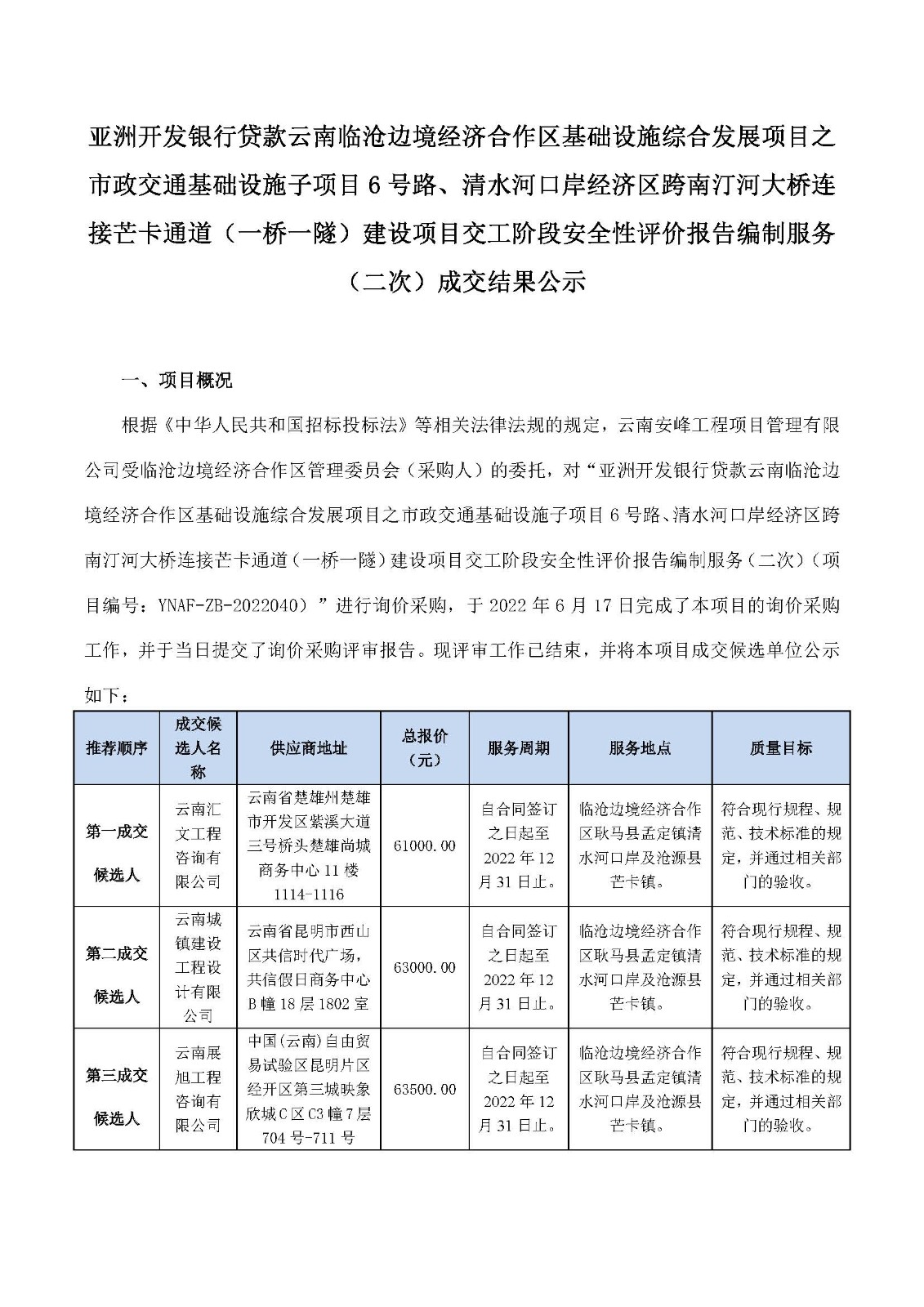 亞洲開發(fā)銀行貸款云南臨滄邊境經(jīng)濟(jì)合作區(qū)基礎(chǔ)設(shè)施綜合發(fā)展項(xiàng)目之市政交通基礎(chǔ)設(shè)施子項(xiàng)目6號(hào)路、清水河口岸經(jīng)濟(jì)區(qū)跨南汀河大橋連接芒卡通道(一橋一隧)建設(shè)項(xiàng)目交工階段安全性評(píng)價(jià)報(bào)告編制服務(wù) (二次)