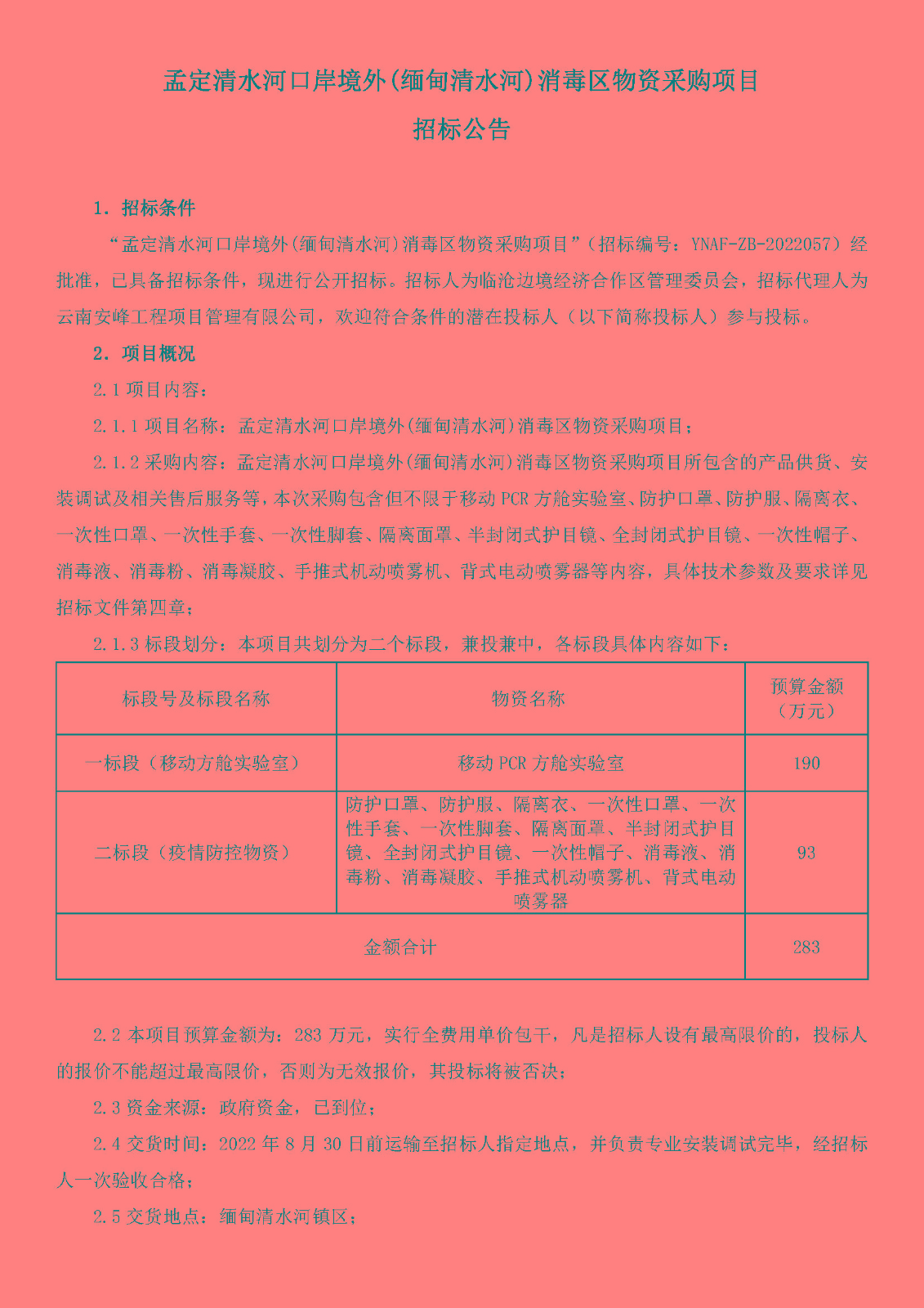 孟定清水河口岸境外(緬甸清水河)消毒區(qū)物資采購項目