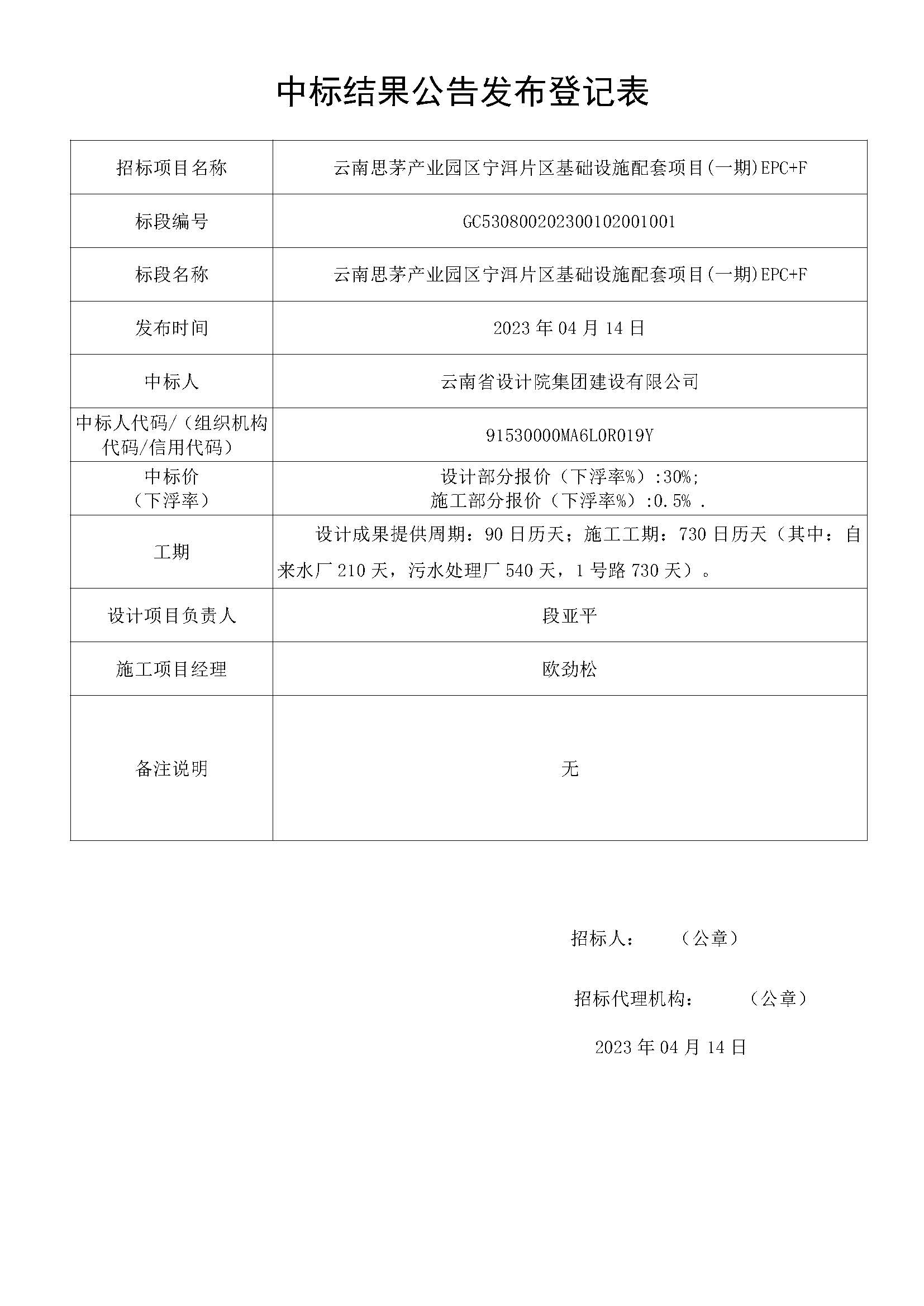 云南思茅產(chǎn)業(yè)園區(qū)寧洱片區(qū)基礎(chǔ)設(shè)施配套項目(一期)EPC+F中標結(jié)果公告