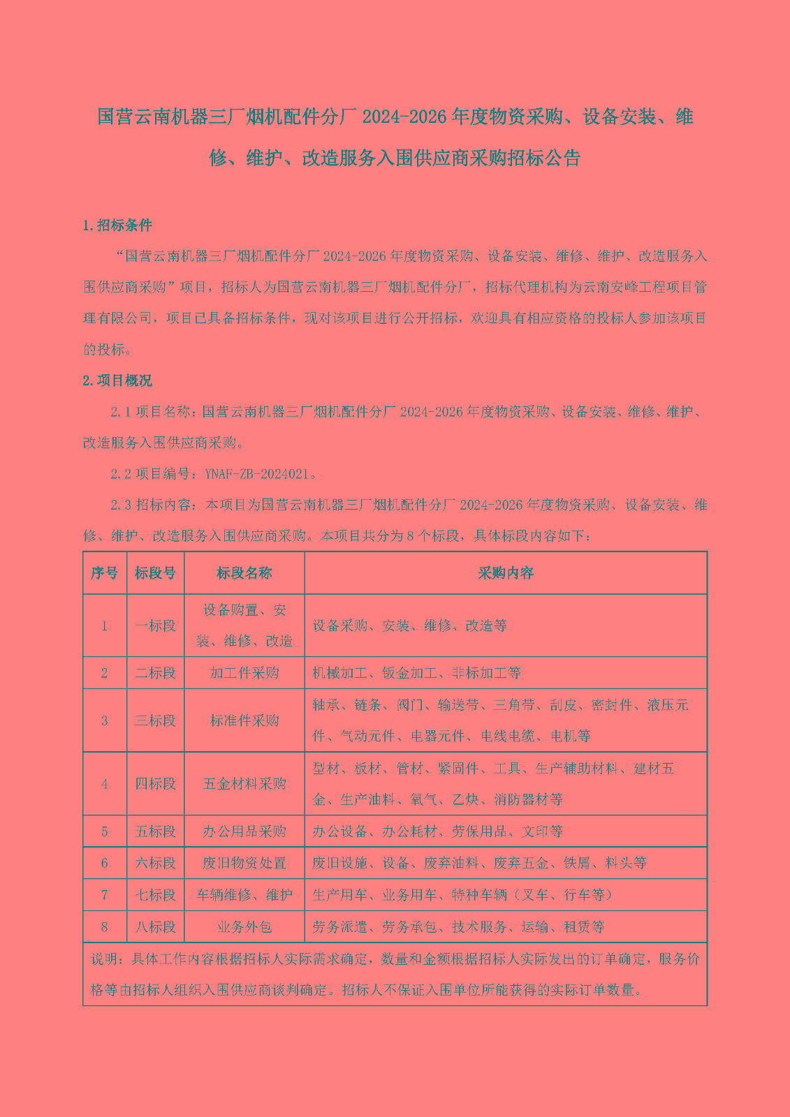 國營云南機器三廠煙機配件分廠2024-2026年度物資采購、設(shè)備安裝、維修、維護、改造服務(wù)入圍供應(yīng)商采購招標(biāo)公告