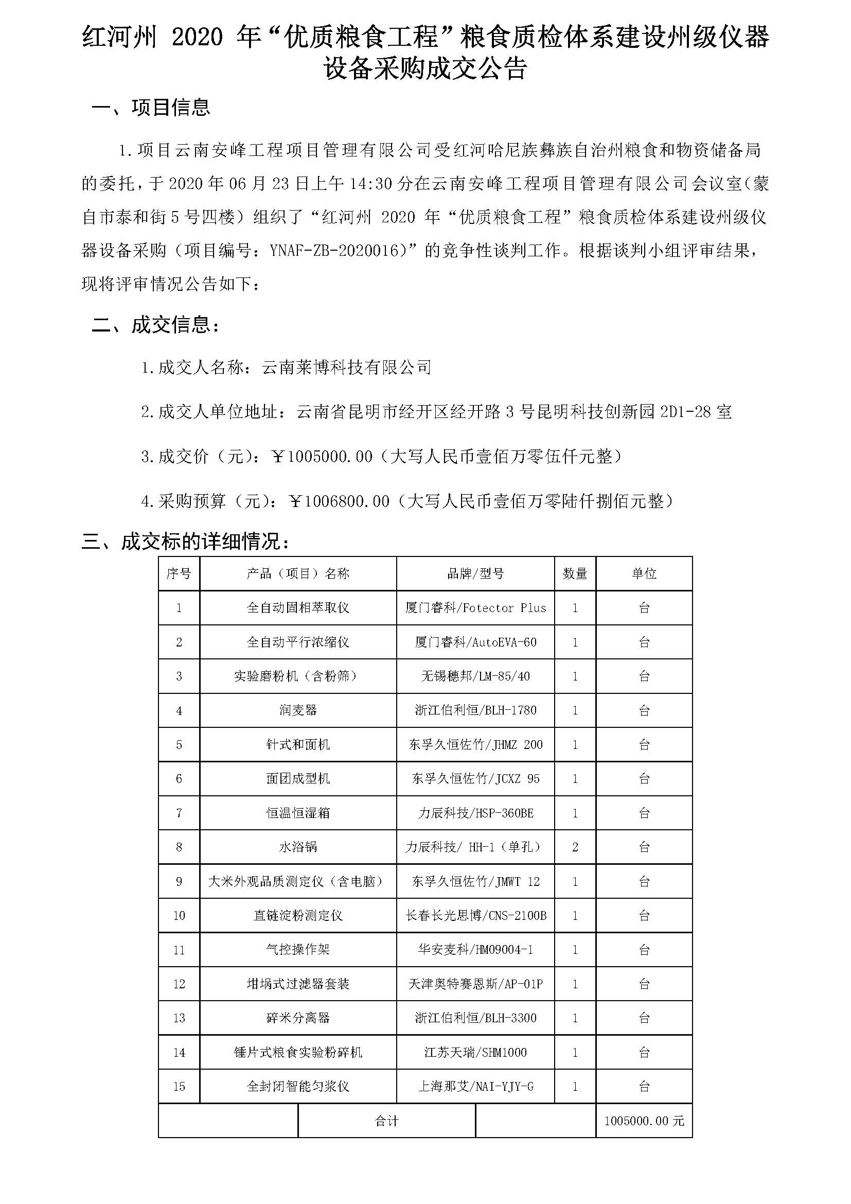 紅河州 2020 年“優(yōu)質(zhì)糧食工程”糧食質(zhì)檢體系建設(shè)州級(jí)儀器設(shè)備采購(gòu)成交公告