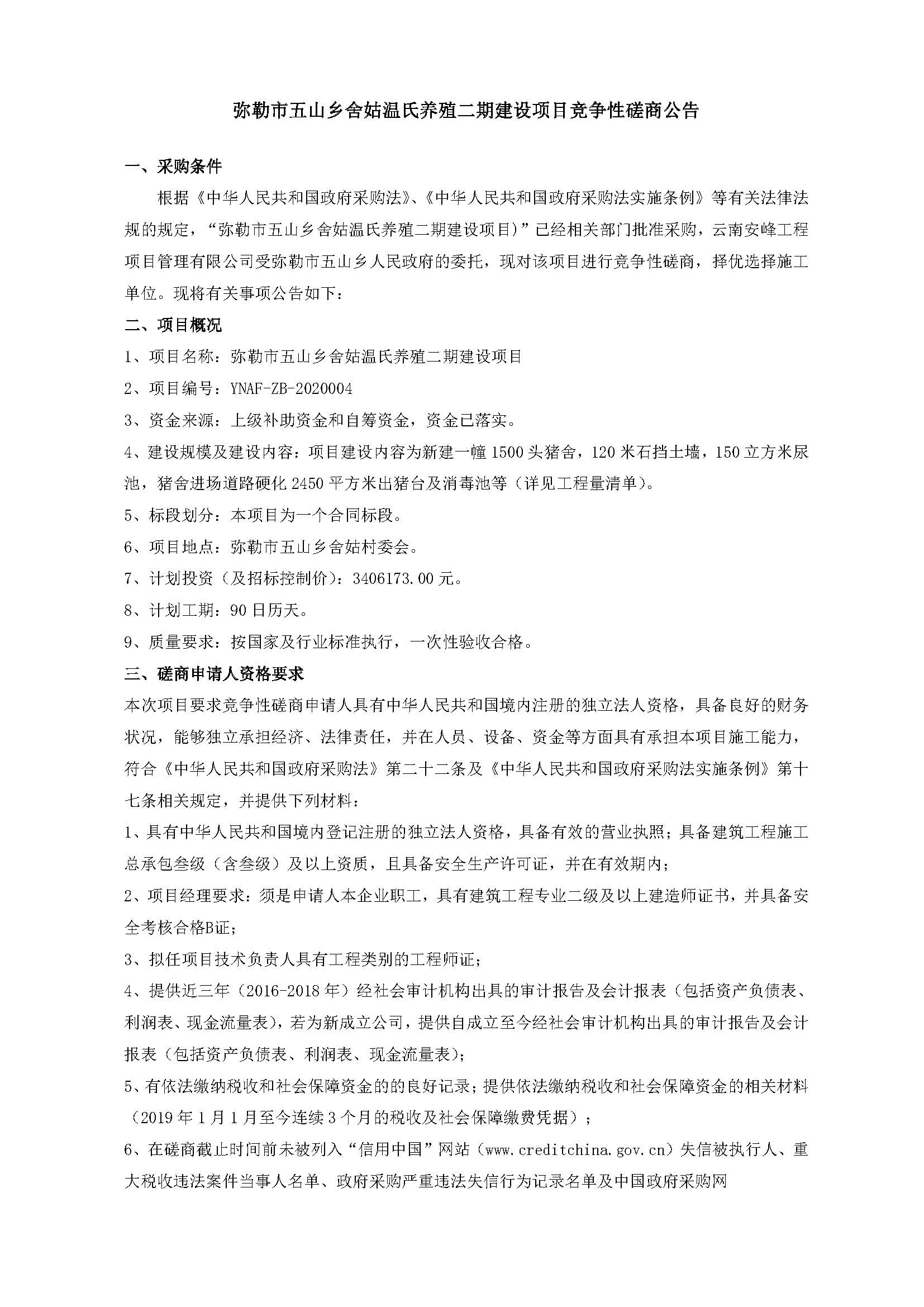 彌勒市五山鄉(xiāng)舍姑溫氏養(yǎng)殖二期建設(shè)項(xiàng)目競爭性磋商