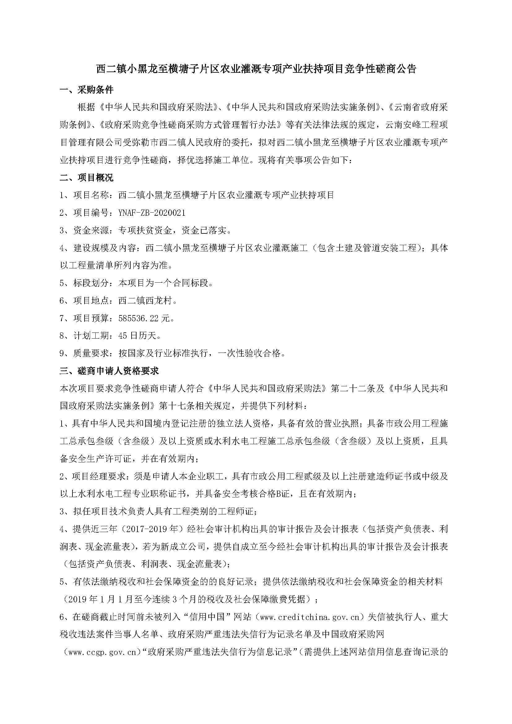 西二鎮(zhèn)小黑龍至橫塘子片區(qū)農(nóng)業(yè)灌溉專項(xiàng)產(chǎn)業(yè)扶持項(xiàng)目競(jìng)爭(zhēng)性磋商公告