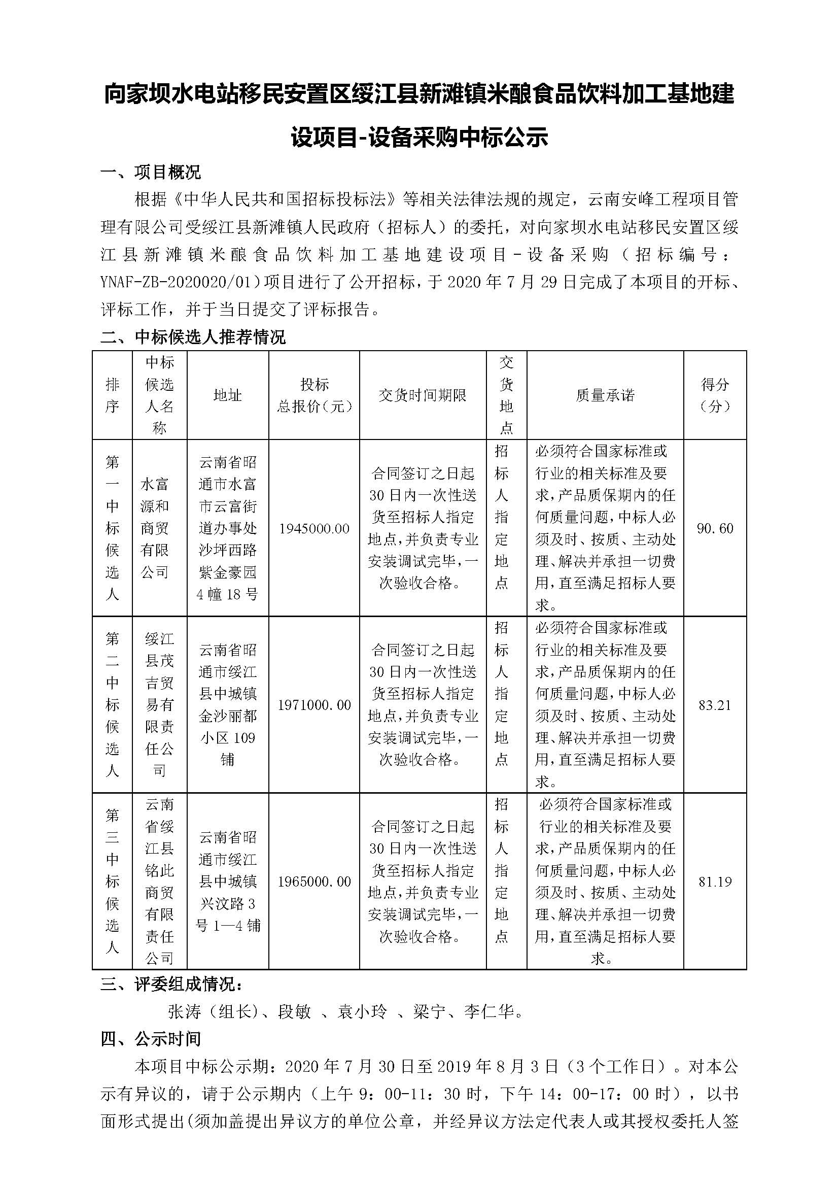 向家壩水電站移民安置區(qū)綏江縣新灘鎮(zhèn)米釀食品飲料加工基地建設(shè)項目-設(shè)備采購中標(biāo)公示