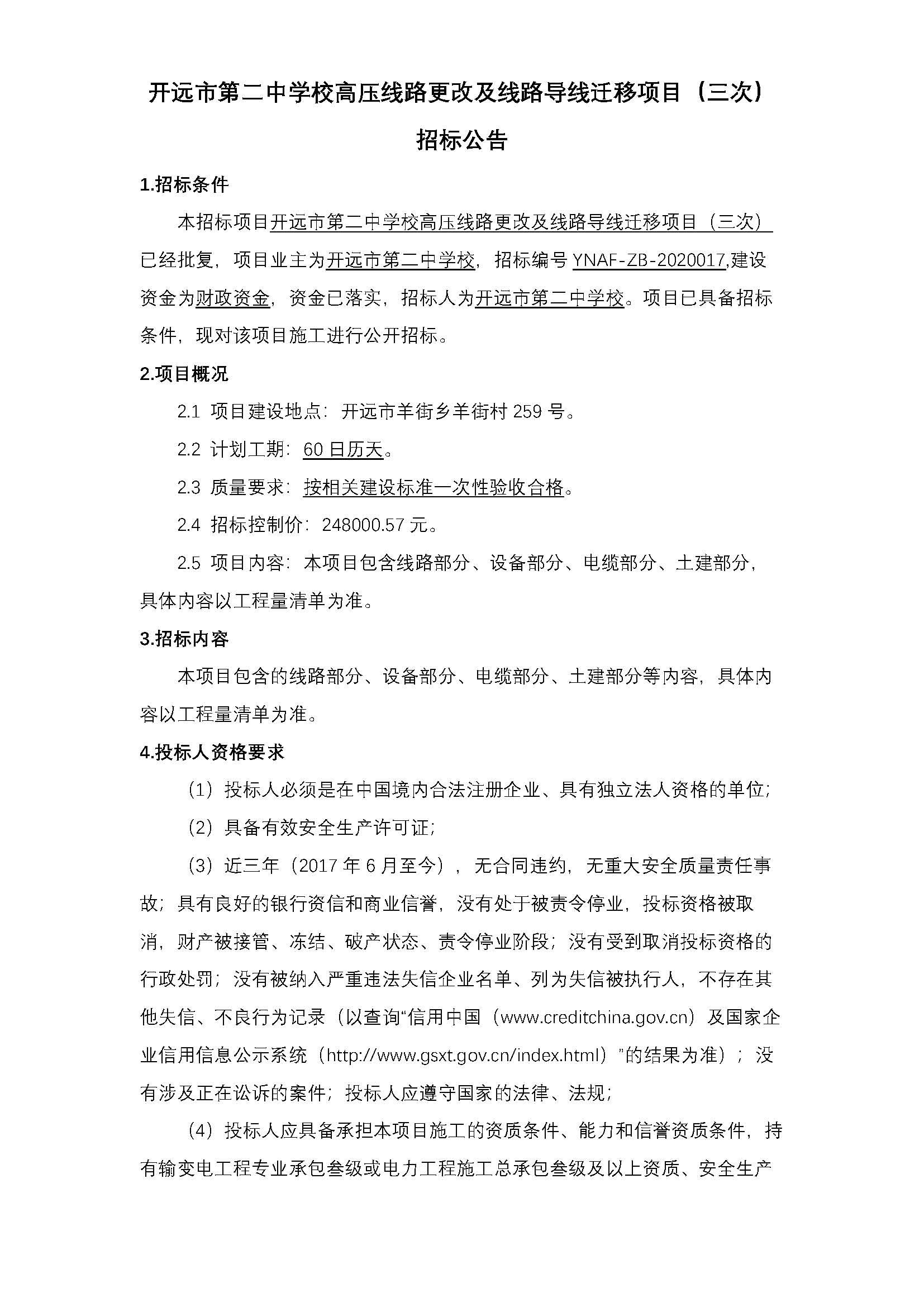 開遠(yuǎn)市第二中學(xué)校高壓線路更改及線路導(dǎo)線遷移項(xiàng)目(三次)招標(biāo)公告