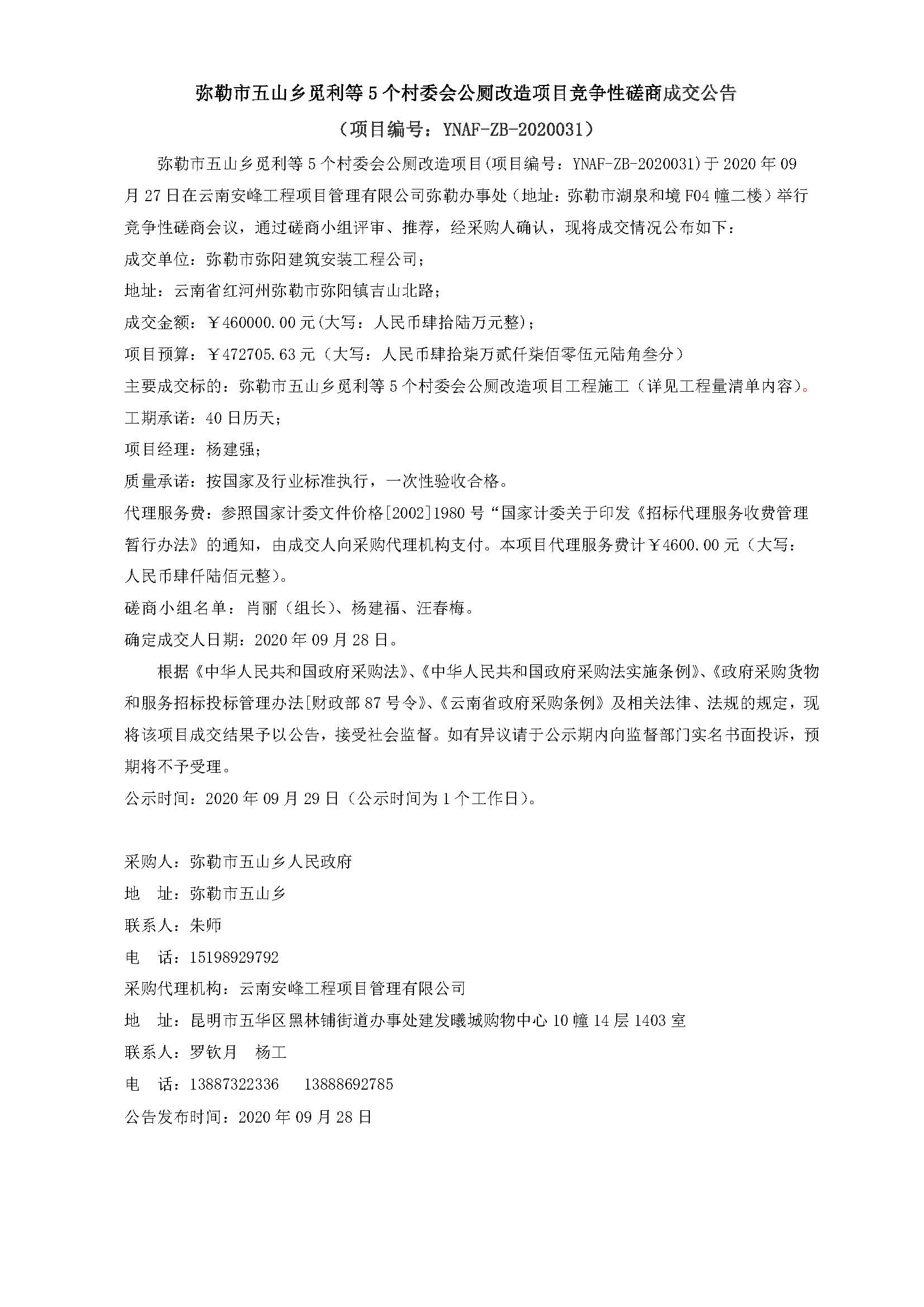 彌勒市五山鄉(xiāng)覓利等5個(gè)村委會(huì)公廁改造項(xiàng)目競(jìng)爭(zhēng)性磋商成交公告