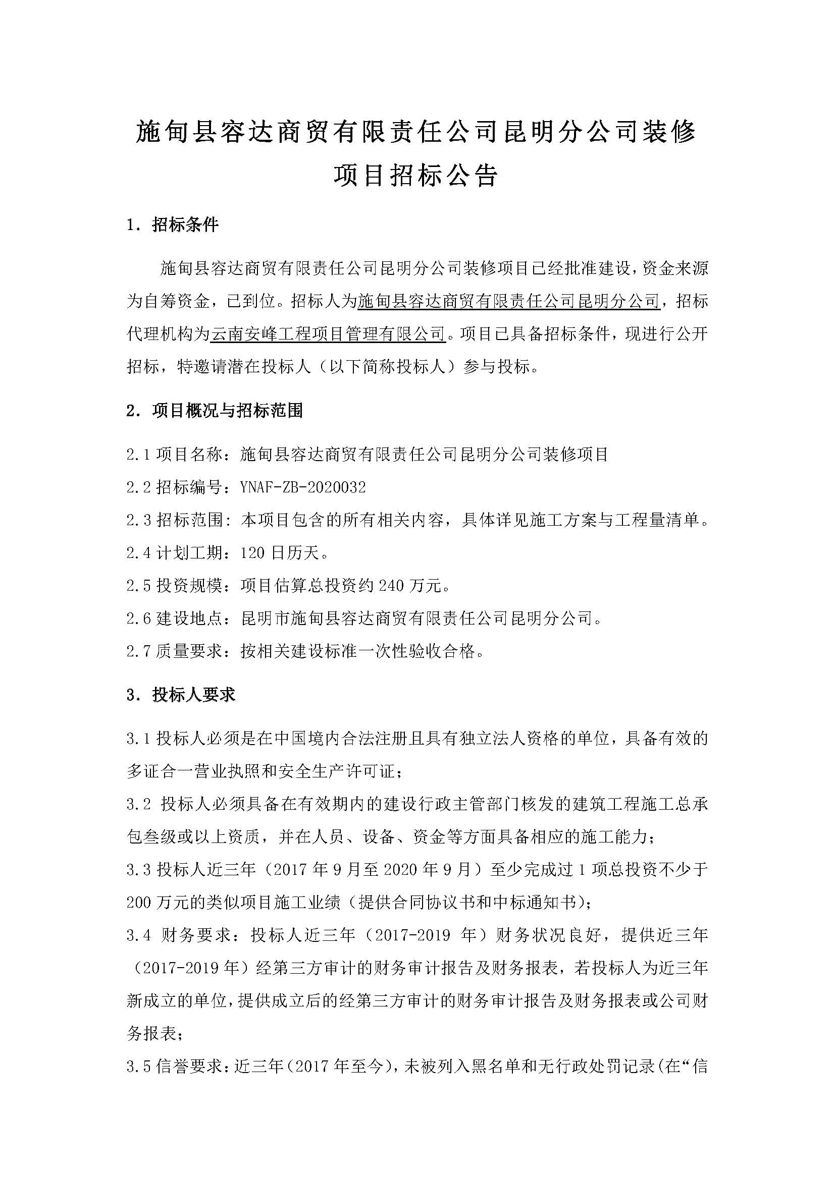 施甸縣容達商貿有限責任公司昆明分公司裝修項目招標公告