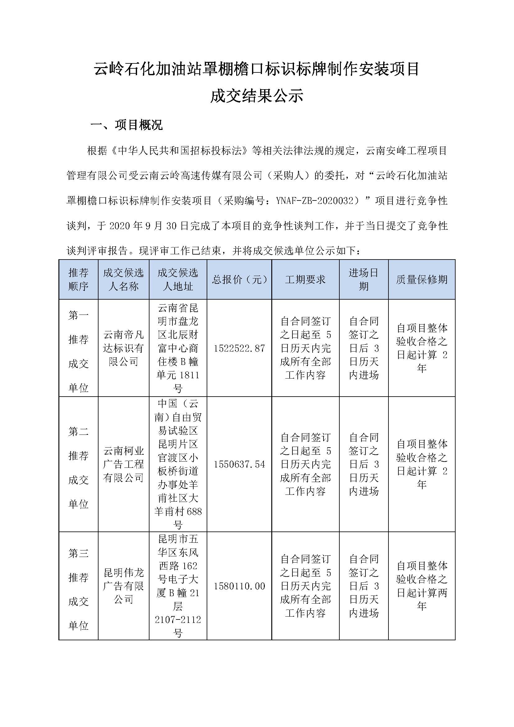 云嶺石化加油站罩棚檐口標識標牌制作安裝項目 成交結(jié)果公示