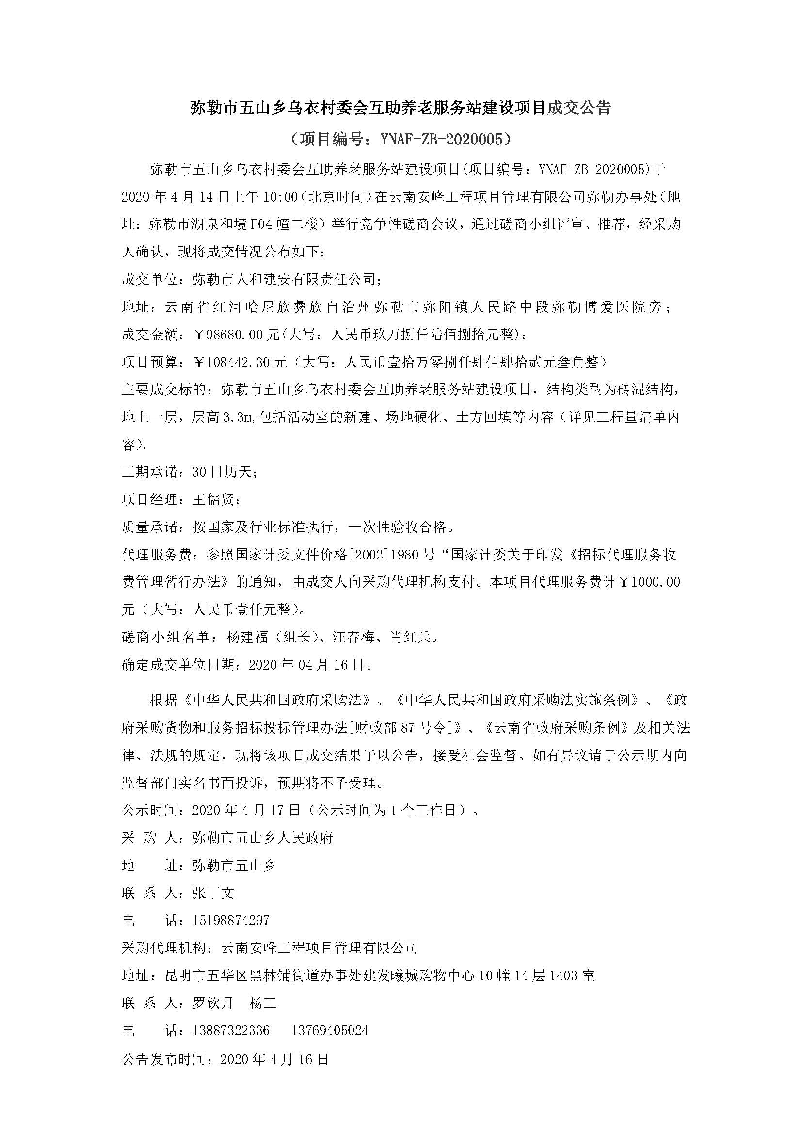 彌勒市五山鄉(xiāng)烏衣村委會互助養(yǎng)老服務站建設項目成交公告