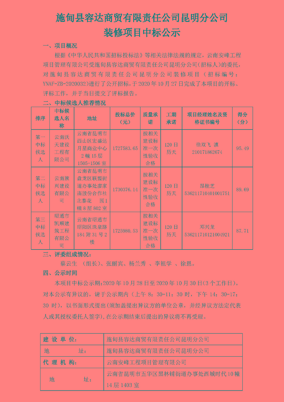 施甸縣容達(dá)商貿(mào)有限責(zé)任公司昆明分公司 裝修項目中標(biāo)公示