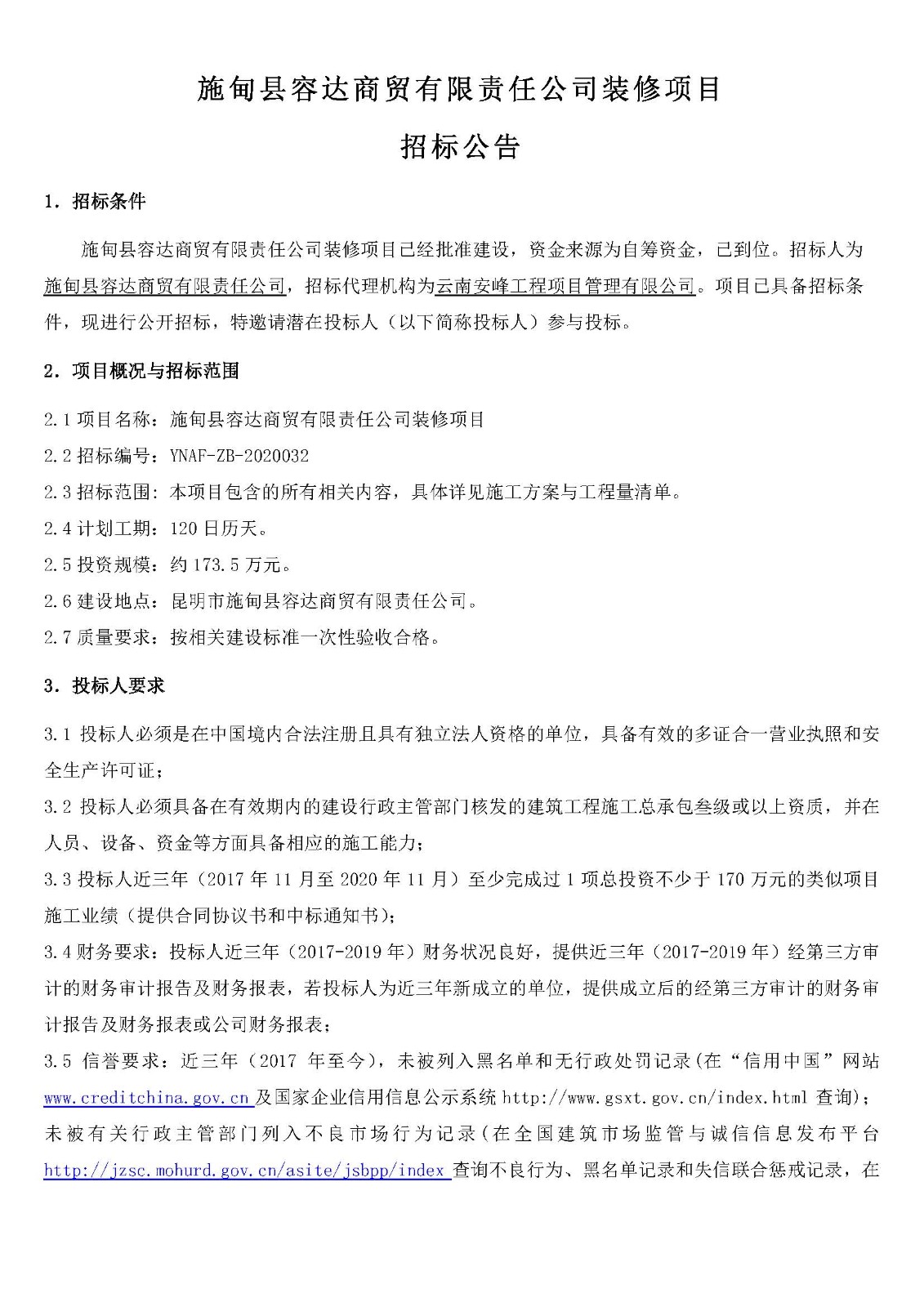 施甸縣容達商貿有限責任公司裝修項目招標公告